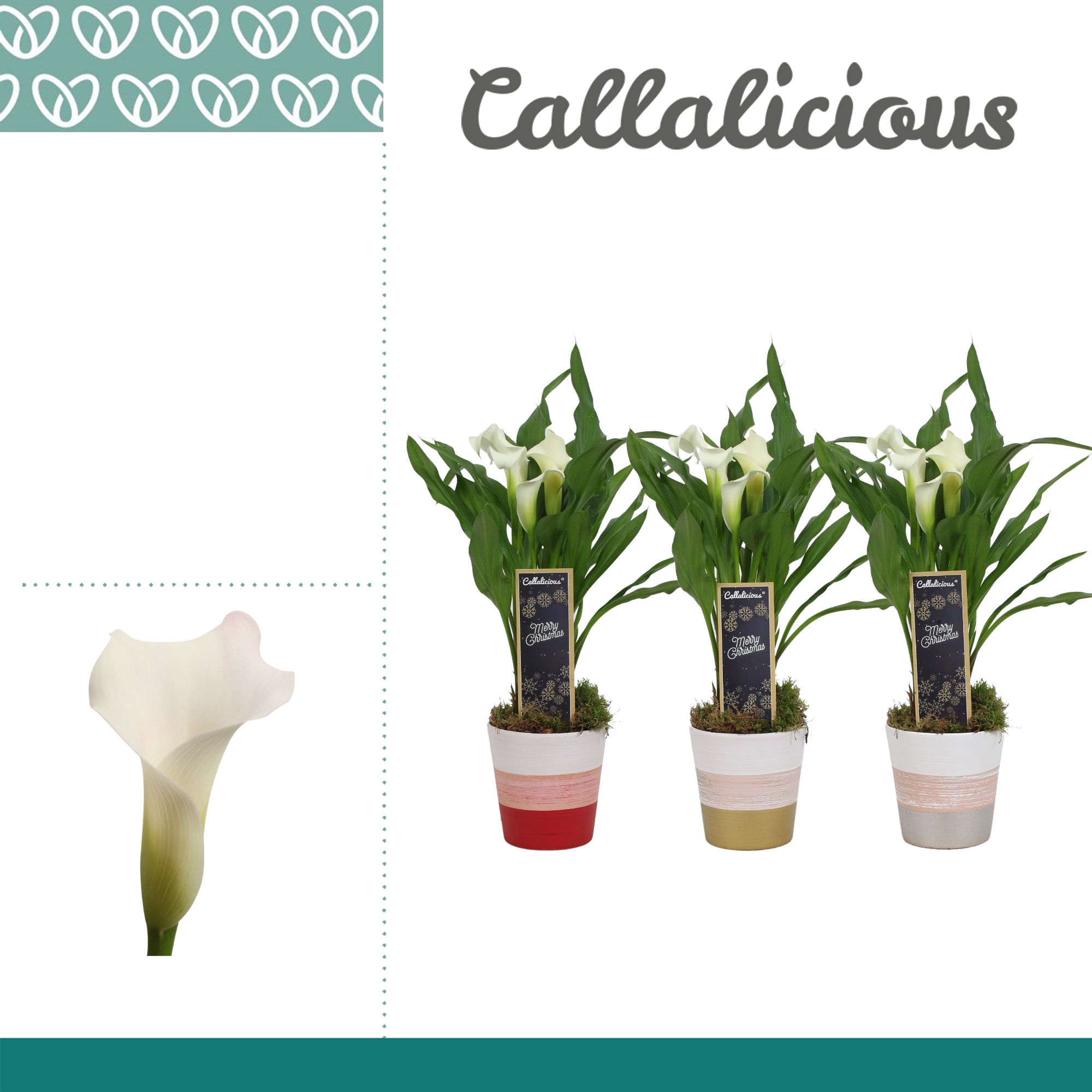 Marketing concept Callalicious Care: Temperature minimum 5 °C Potting material cultivation pot >80% Post Consumer Recyclaat (PCR) Certificaten MPS-GAP MPS-GAP Certificaten Socialy Qualified MPS-SQ Certificaten GLOBALG. A.P GlobalGAP Flowers & Ornamentals Certificaten MPS Quality MPS-Quality Certificates GRASP GRASP Positive quality inspection code with consumer information Pot size 12 cm Min plant height including pot 35 cm Maturity stage 2-2 Min number of flowers/inflorescences pot 2 Flower/berry/fruit colour 1 white Pot shape Sierpot Repotting potting material ceramics Cultivation medium 100% peat free Country of origin Netherlands Quality group A1 Theme days Christmas