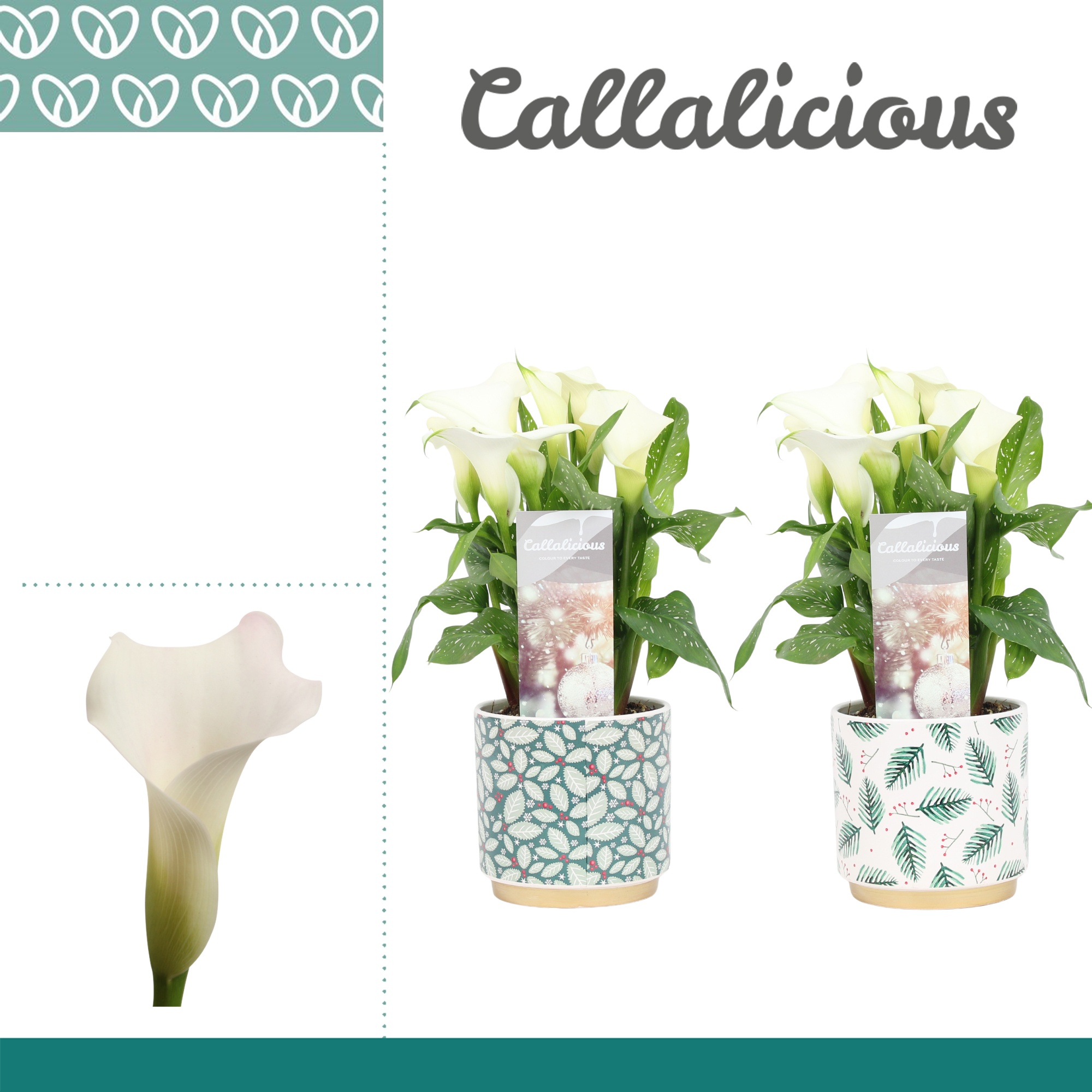Marketing concept Callalicious Care: Temperature minimum 5 °C Potting material cultivation pot >80% Post Consumer Recyclaat (PCR) Certificaten MPS-GAP MPS-GAP Certificaten Socialy Qualified MPS-SQ Certificaten GLOBALG. A.P GlobalGAP Flowers & Ornamentals Certificaten MPS Quality MPS-Quality Certificates GRASP GRASP Pot size 12 cm Min plant height including pot 35 cm Maturity stage 3-4 Min number of flowers/inflorescences pot 2 Transport height 50 cm Flower/berry/fruit colour 1 white Repotting potting material ceramics Cultivation medium 100% peat free Country of origin Netherlands Theme days Christmas