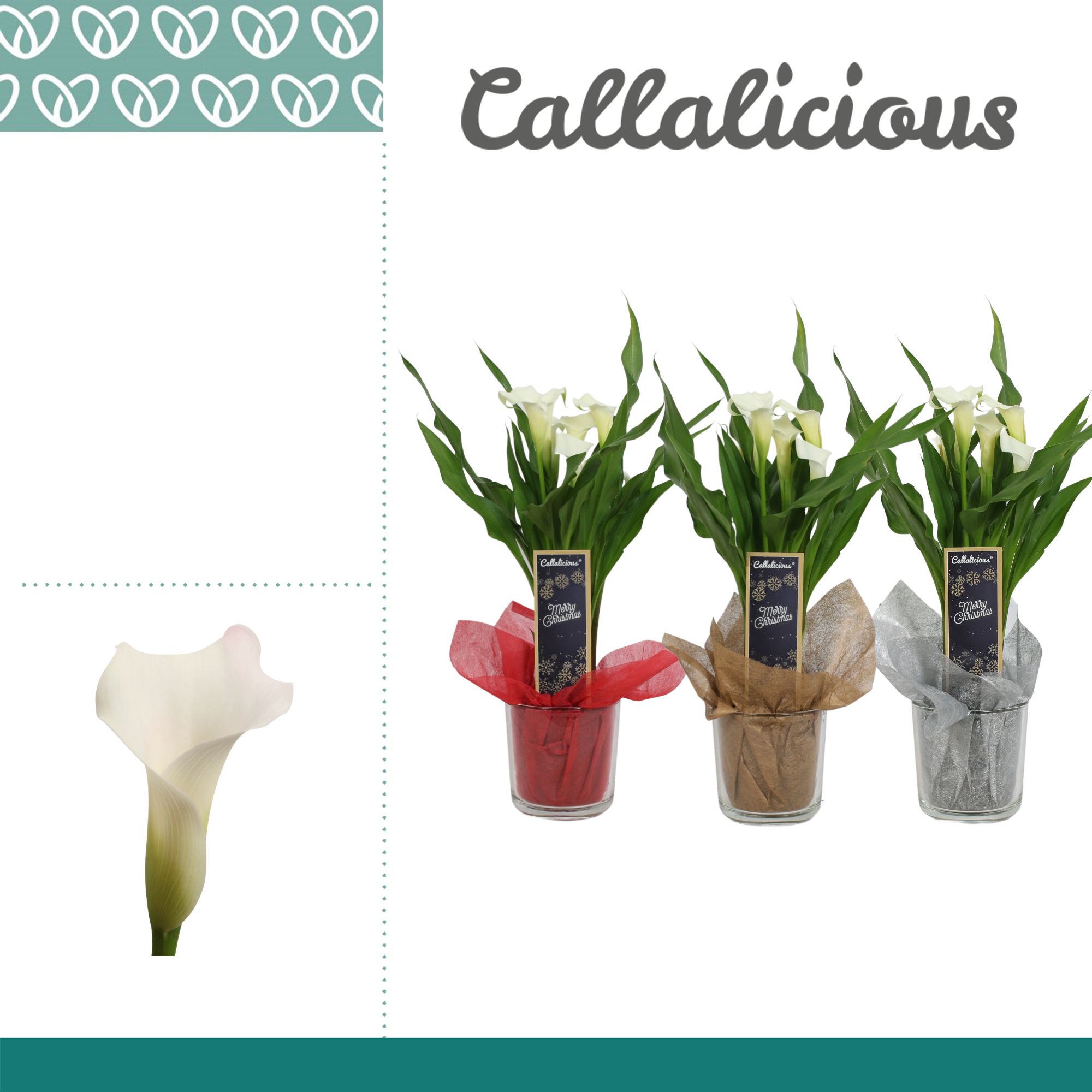 Marketingconcept Callalicious Verzorging: Temperatuur minimaal 5 °C Potmateriaal kweekpot >80% Post Consumer Recyclaat (PCR) Certificaten MPS-GAP MPS-GAP Certificaten Socialy Qualified MPS-SQ Certificaten GLOBALG.A.P GlobalGAP Flowers & Ornamentals Certificaten MPS Quality MPS-Quality Certificaten GRASP GRASP Potmaat 12 cm Min planthoogte inclusief pot 35 cm Rijpheidsstadium 3-4 Min aantal bloemen/bloeiwijzen pot 2 Bloem/bes/vruchtkleur 1 wit Potmateriaal ompot glas Teeltmedium 100% veen vrij Land van herkomst Nederland Themadagen Kerst