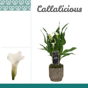Marketingconcept Callalicious Verzorging: Temperatuur minimaal 5 °C Potmateriaal kweekpot >80% Post Consumer Recyclaat (PCR) Certificaten MPS-GAP MPS-GAP Certificaten Socialy Qualified MPS-SQ Certificaten GLOBALG.A.P GlobalGAP Flowers & Ornamentals Certificaten MPS Quality MPS-Quality Certificaten GRASP GRASP Positieve keurcode kwaliteit met consumenten informatie Potmaat 12 cm Min planthoogte inclusief pot 50 cm Rijpheidsstadium 2-2 Min aantal bloemen/bloeiwijzen pot 2 Bloem/bes/vruchtkleur 1 wit Potvorm sierpot Potmateriaal ompot keramiek Teeltmedium 100% veen vrij Land van herkomst Nederland Kwaliteitsgroep A1 Themadagen Kerst