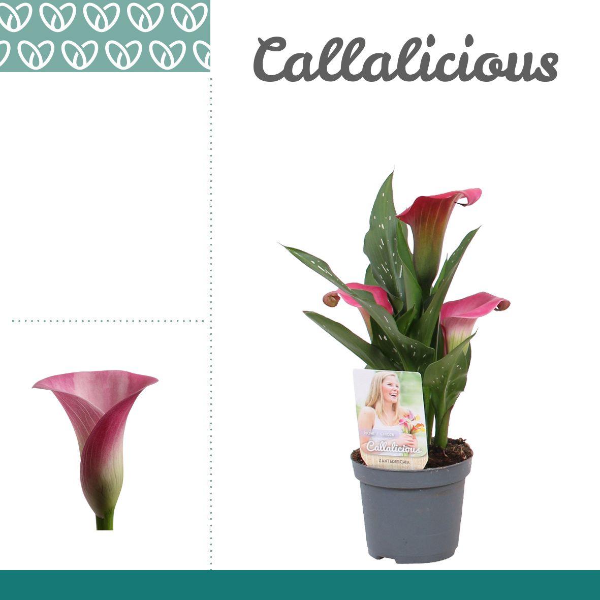 Marketingconcept Callalicious Verzorging: Temperatuur minimaal 5 °C Potmateriaal kweekpot >80% Post Consumer Recyclaat (PCR) Certificaten MPS-GAP MPS-GAP Certificaten Socialy Qualified MPS-SQ Certificaten GLOBALG.A.P GlobalGAP Flowers & Ornamentals Certificaten MPS Quality MPS-Quality Certificaten GRASP GRASP Potmaat 9 cm Min planthoogte inclusief pot 25 cm Rijpheidsstadium 2-2 Min aantal bloemen/bloeiwijzen pot 2 Bloem/bes/vruchtkleur 1 roze Teeltmedium 100% veen vrij Land van herkomst Nederland Kwaliteitsgroep A1
