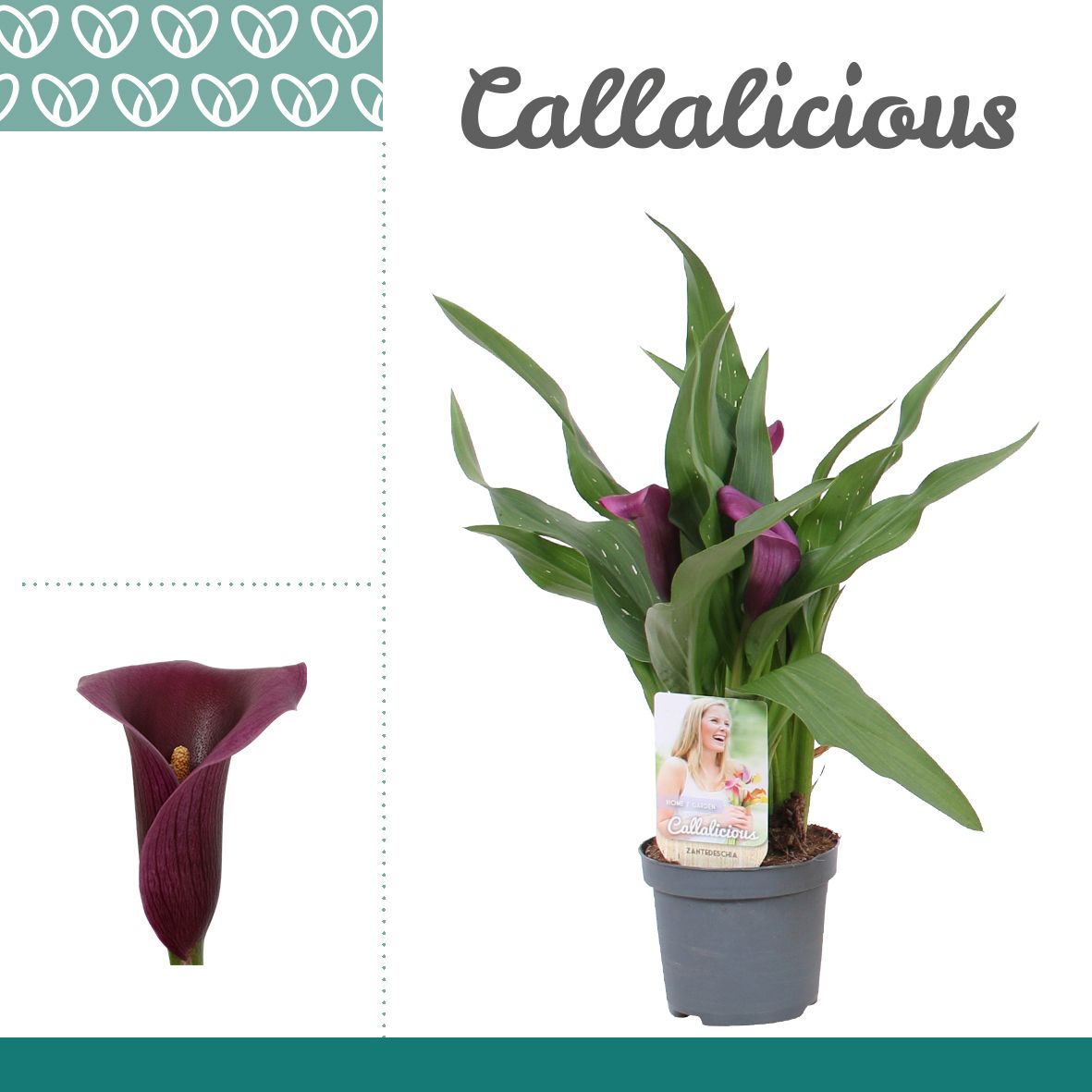Marketingconcept Callalicious Verzorging: Temperatuur minimaal 5 °C Potmateriaal kweekpot >80% Post Consumer Recyclaat (PCR) Certificaten MPS-GAP MPS-GAP Certificaten Socialy Qualified MPS-SQ Certificaten GLOBALG.A.P GlobalGAP Flowers & Ornamentals Certificaten MPS Quality MPS-Quality Certificaten GRASP GRASP Potmaat 9 cm Min planthoogte inclusief pot 25 cm Rijpheidsstadium 2-2 Min aantal bloemen/bloeiwijzen pot 2 Bloem/bes/vruchtkleur 1 paars Potkleur antraciet Teeltmedium 100% veen vrij Land van herkomst Nederland Kwaliteitsgroep A1